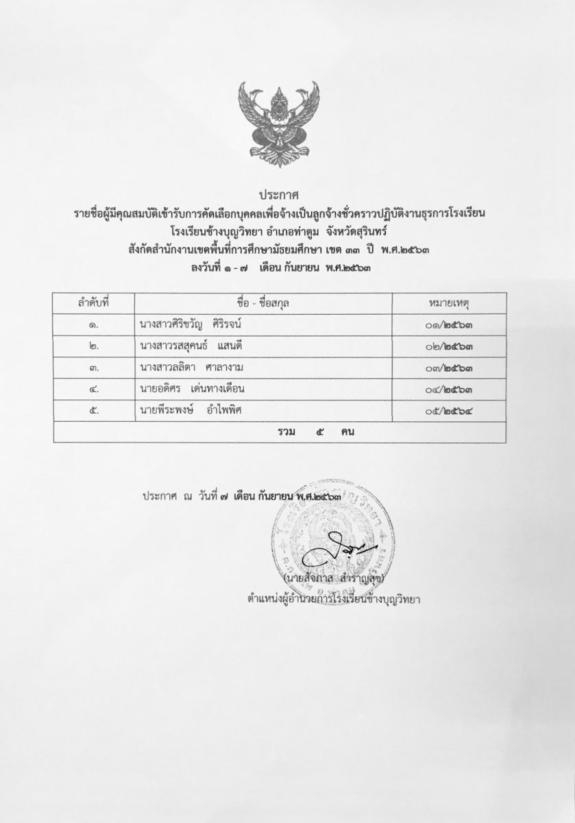 ประกาศ รายชื่อผู้มีสิทธิ์เข้ารับการคัดลือกบุคคลเพื่อจ้างเป็นลูกจ้างชั่วคราวปฏบัติงานธุรการโรงเรียน
