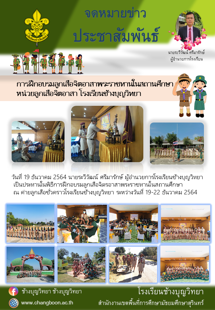 วันที่ 19 ธันวาคม 2564 นายระวีวัฒน์ ศรีมารักษ์ ผู้อำนวยการโรงเรียนช้างบุญวิทยา เป็นประทานในพิธีการฝึกอบรมลูกเสือจิตรอาสาพระราชทานในสถานศึกษา ณ ค่ายลูกเสือชั่วคราวโรงเรียนช้างบุญวิทยา ระหว่างวันที่ 1