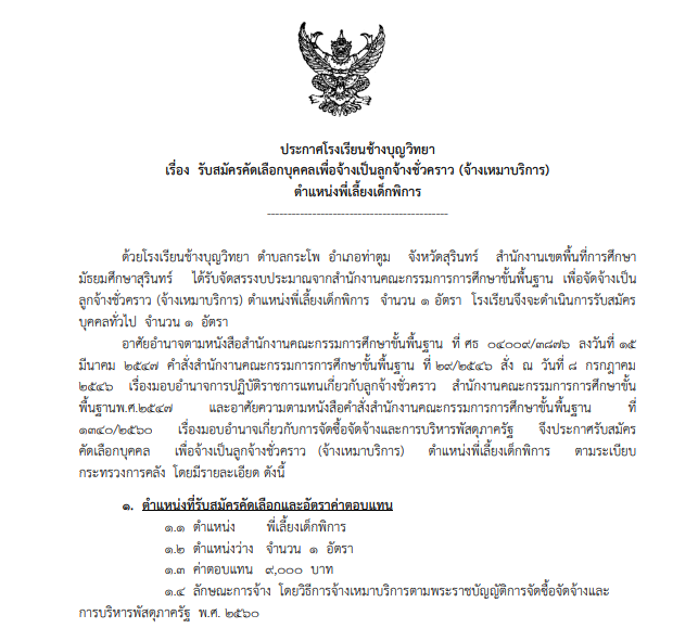 รับสมัครคัดเลือกบุคคลเพื่อจ้างเป็นลูกจ้างชั่วคราว (จ้างเหมาบริการ) ตำแหน่งพี่เลี้ยงเด็กพิการ