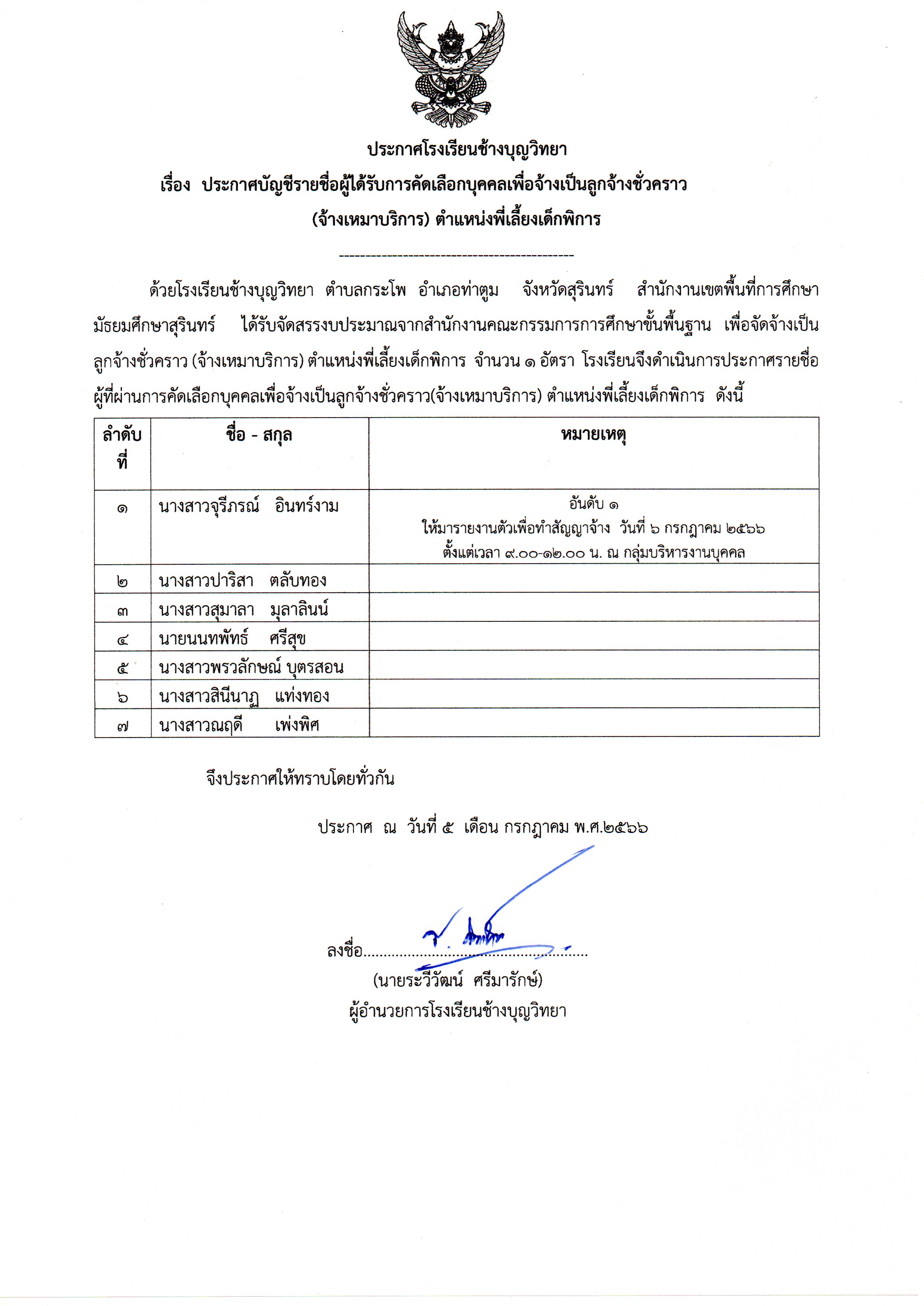 ประกาศรายชื่อผู้ผ่านการคัดเลือกตำแหน่งพี่เลี้ยงเด็กพิการ