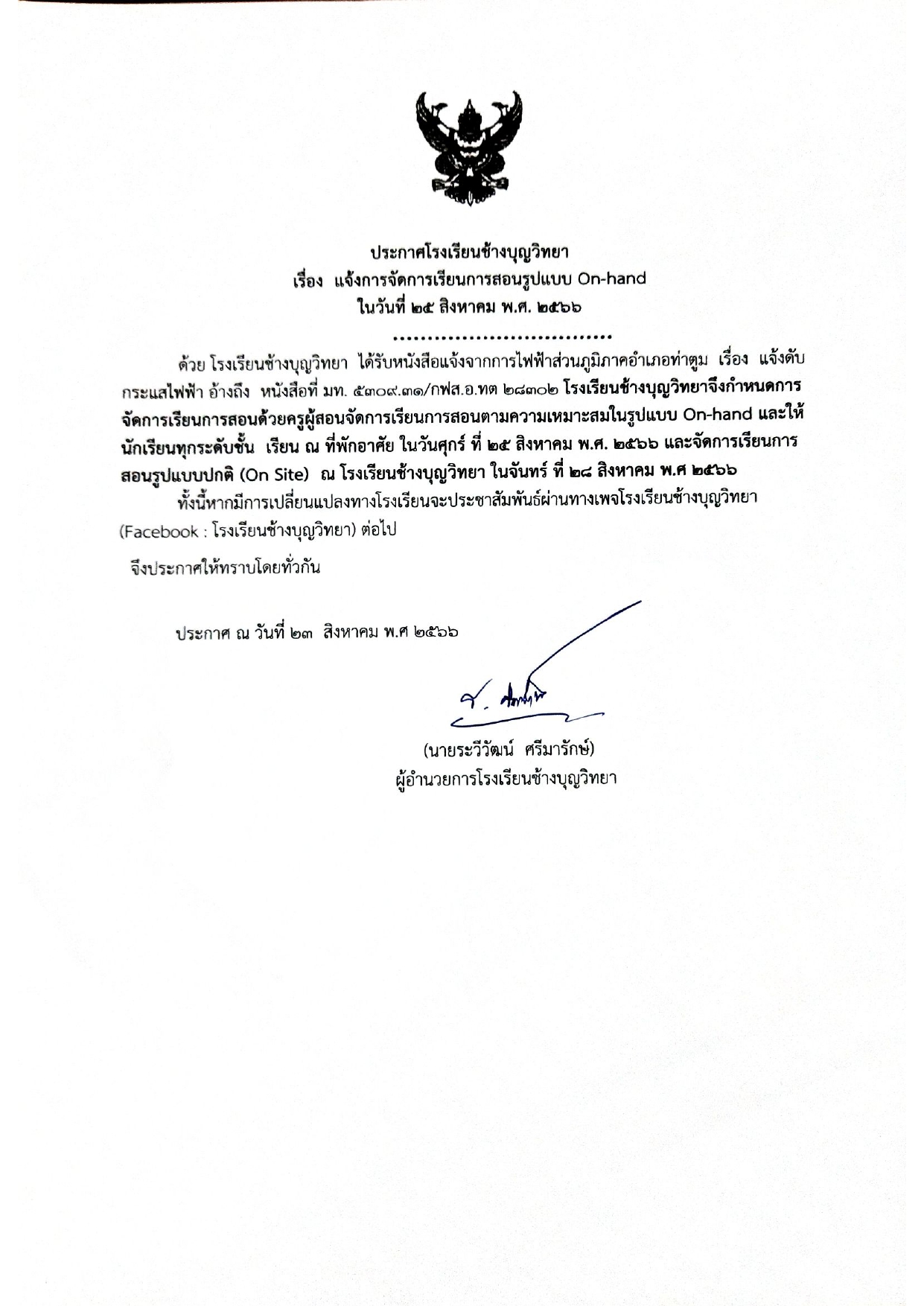 ประกาศเรียน on-hand วันศุกร์ที่ 25 ส.ค. 2566